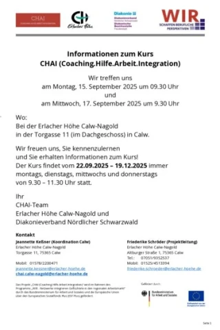 Die aktuellen Kurse im Projekt CHAI finden in Calw und in Nagold statt, die nächsten Kurse starten ab 01.2026 in Calw und in Nagold.