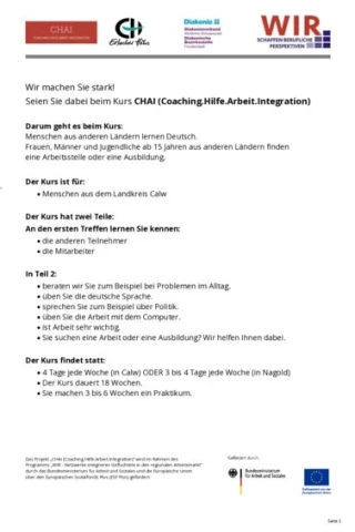 Das ESF Plus-Projekt “CHAI - Coaching.Hilfe.Arbeit.Integration” richtet sich an Menschen mit Fluchthintergrund aus den Landkreisen Calw und Freudenstadt.