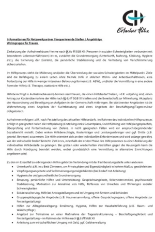 - Frauenspezifische Beratung und persönliche Betreuung, Clearingfunktion, gegebenenfalls Vermittlung in entsprechende weiterführende stationäre oder ambulante Hilfen